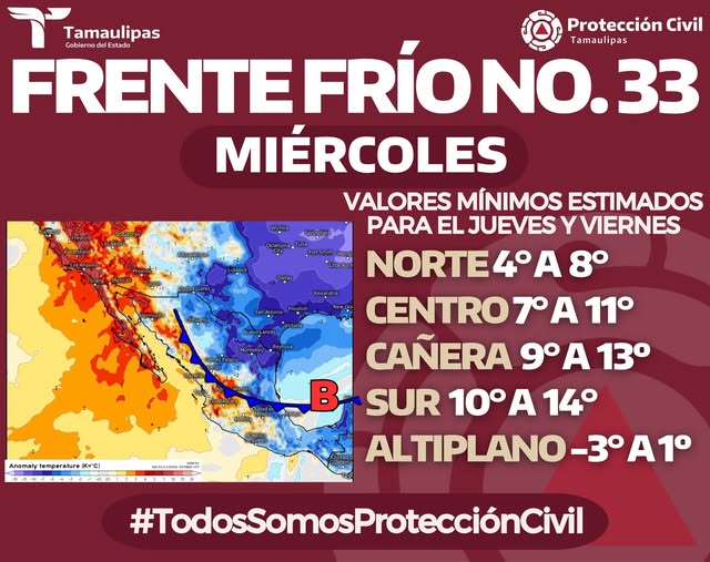 Un nuevo frente frío cruzará Tamaulipas entre miércoles y jueves, generando un descenso en las temperaturas y condiciones climáticas adversas en distintas regiones del estado.