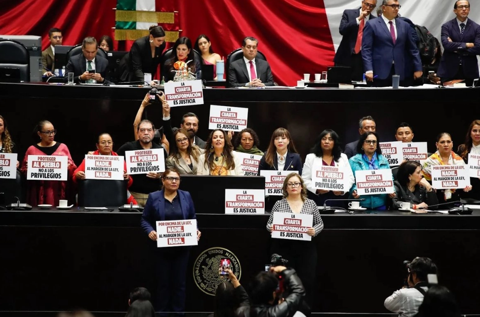 Los legisladores de Morena suben a tribuna con pancartas en apoyo a la Ley de Amparo, durante la sesión en la Cámara de Diputados, en la Ciudad de México, el 14 de octubre de 2025.