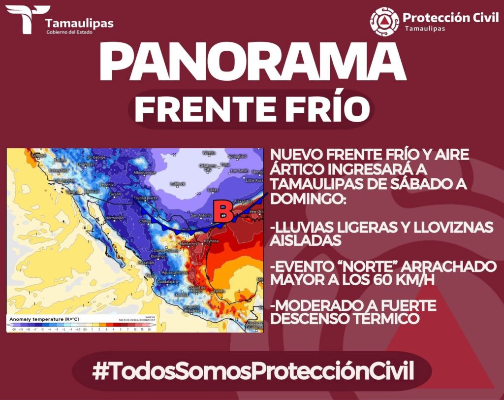 Una masa de aire ártico ingresará de manera paulatina al estado de Tamaulipas entre el sábado y el domingo, dependiendo de la región, lo que provocará un moderado a fuerte descenso en las temperaturas, de acuerdo con los pronósticos meteorológicos.