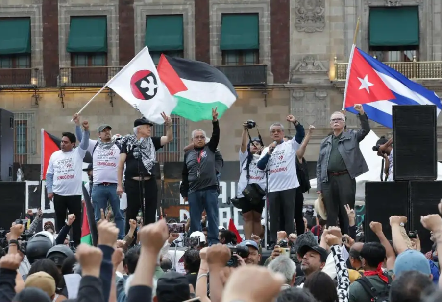 En la plancha de la Plaza, predominan las banderas con logos de las Universidad Nacional Autónoma de México (UNAM, el Instituto Politécnico Nacional (IPN), la Universidad Autónoma Metropolitana (UAM) y Palestina, junto con banderines con el símbolo del movimiento (una paloma blanca asesinada).