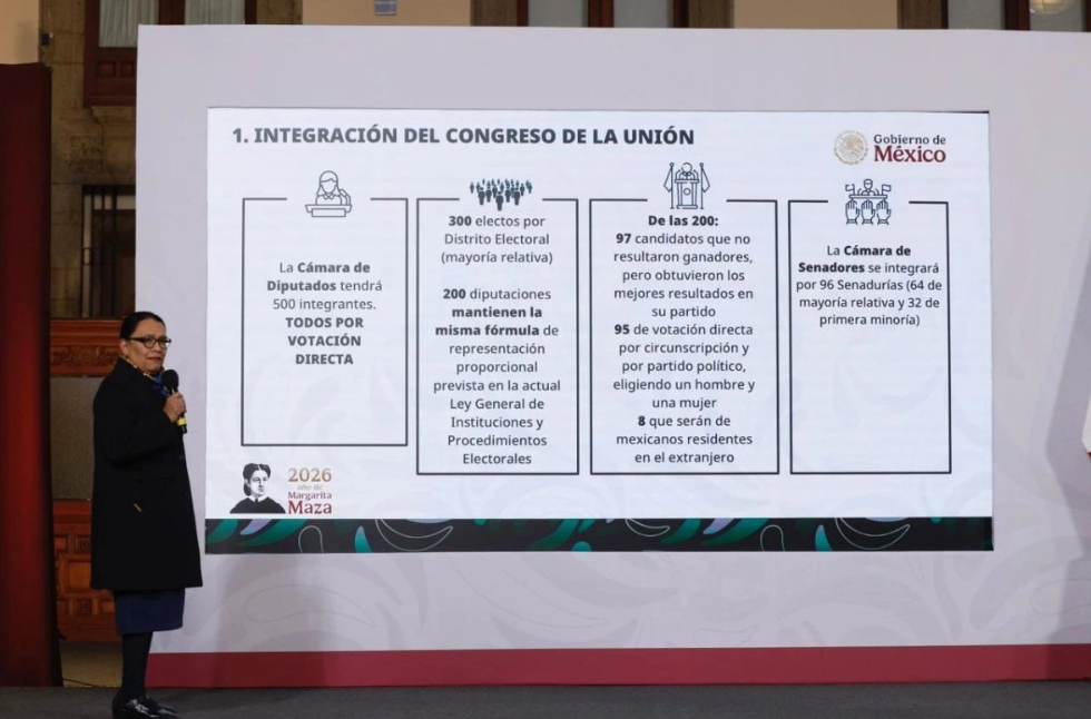 Ciudad de México. La iniciativa de reforma electoral de la presidenta Claudia Sheinbaum propone la reducción de la integración en el Senado que pasa de 128 a 96 senadores, eliminando la lista de plurinominales para quedar solo los 64 senadores de mayoría y 32 de primera minoría. En cuanto a la Cámara de Diputados se preservan los 500 diputados federales, 300 se elegirán en los distritos y los 200 de representación proporcional(97 que no ganaron pero obtuvieron mayores votos); 95 de votación directa por circunscripción y 8 electos por mexicanos en el exterior.