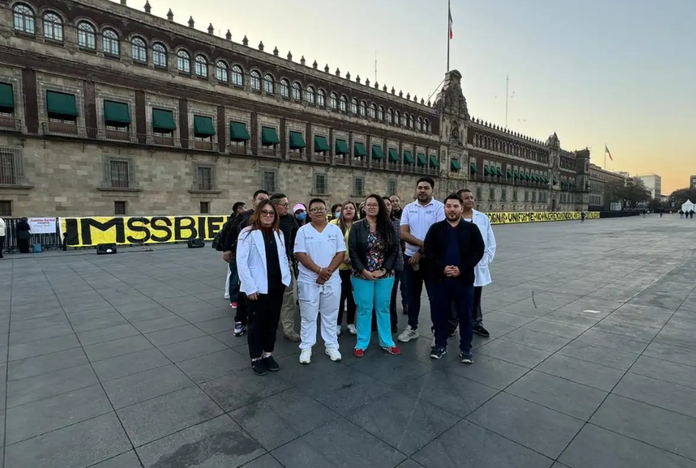 Ciudad de México. Con una gran manta desplegada sobre las vallas que resguardan el frente de Palacio Nacional, trabajadores del IMSS-Bienestar solicitaron la intervención de la presidenta Claudia Sheinbaum para la instalación de mesas de diálogo resolutivas y atender distintas problemáticas en el sector, entre ellas garantizar insumos médicos suficientes y negociar condiciones laborales dignas.
